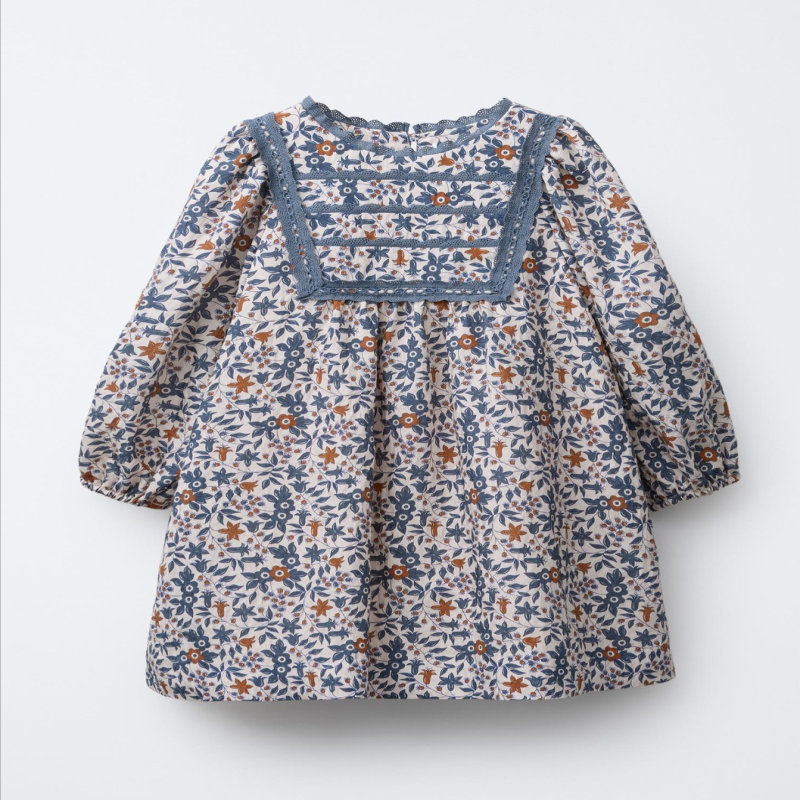 Round neck dress with long sleeves featuring elasticated cuffs. Teardrop button fastening at the back. Lace detail on the yoke and collar. Floral print.